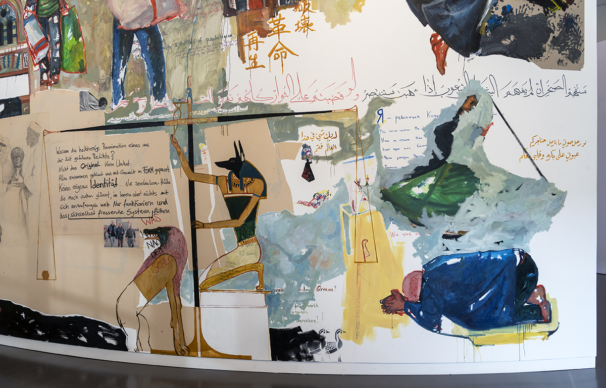 (2) „Unten links im Bild sehen wir eine Gruppe von tanzenden Sufis vor einem Boot mit Afrikaner*innen auf dem Seeweg nach Europa. Diese Szene entwickelte sich vor Ort. Ich wollte in dem Gemälde schmerzhafte, heftige Dinge zeigen, aber gleichzeitig auch verschiedenste Strategien der Selbstbestimmung. Menschen finden trotz aller Widrigkeiten einen Weg, sich von äußeren Bedingungen zu befreien und Spaß zu haben. Die Sufis gehören zu den ärmsten Gruppen Ägyptens, nehmen aber trotzdem ihr Leben in die Hand und schaffen sich Freiraum in der Trance, durch das Tanzen.“